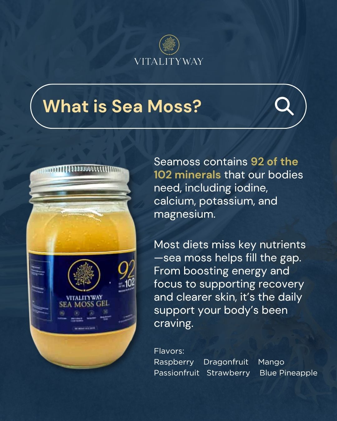 Join our community of health enthusiasts and discover how our premium sea moss products can help you take control of your well-being. Embrace wellness, embrace The Vitality Way—because everyone deserves to experience vitality every day.